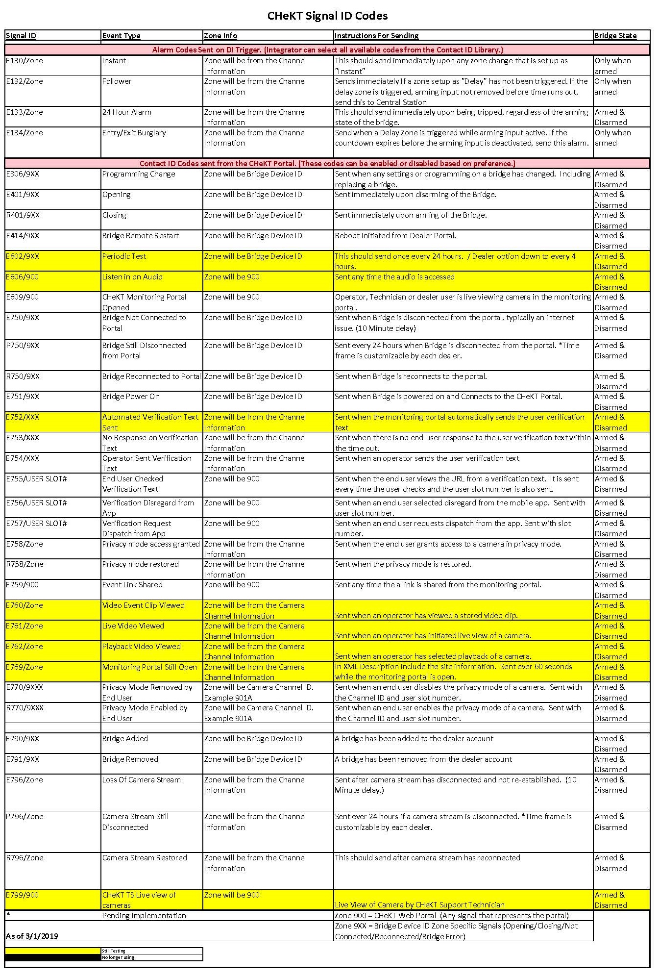 Here is a list of all Contact ID Alarm codes you will need in your automation platform to support CHeKT. The Download is available below.