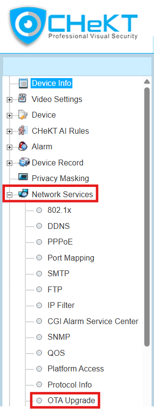 To enable the feature, log into the camera and expand Network Service, and select OTA Upgrade: