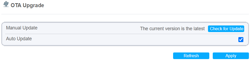 If the OTA Update checkbox is selected and a new firmware version is found under the above conditions, the new firmware will automatically be applied.